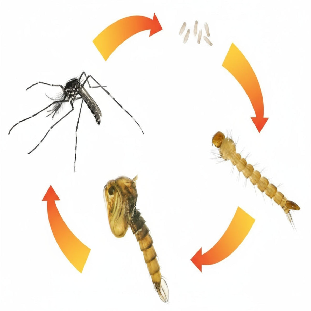 - Celoten razvoj – od jajčeca do ličinke, bube in odrasle žuželke – se zgodi v vodnem okolju. V toplem vremenu (okoli 25 °C) to traja le 10 do 14 dni.
